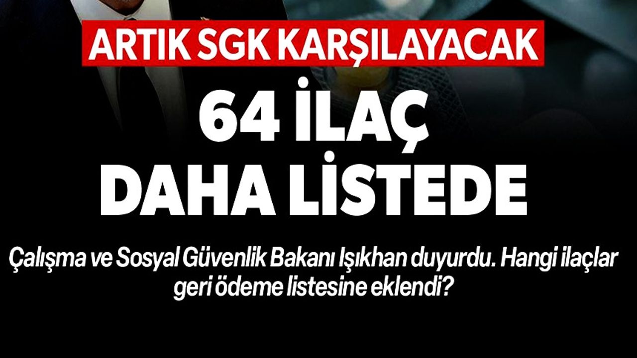 Çalışma ve Sosyal Güvenlik Bakanı Vedat Işıkhan, sosyal medya hesabından yaptığı açıklamada, "Sosyal Güvenlik Kurumumuz tarafından 64 ilacı daha geri ödeme listesine aldık. 5 adet kan ürünü, 3 adet KOAH ilacı, 4 adet diyabet ilacı, 4 adet alerji aşısı, 4 adet antibiyotik, 1 adet biyobenzer göz içi uygulanan ilaç başta olmak üzere 51 adedi yerli üretim ilaçlar ile sağlıkta yerli ve milli üretimle güçlenmeye devam ediyoruz. Milletimize hayırlı uğurlu olsun" dedi.