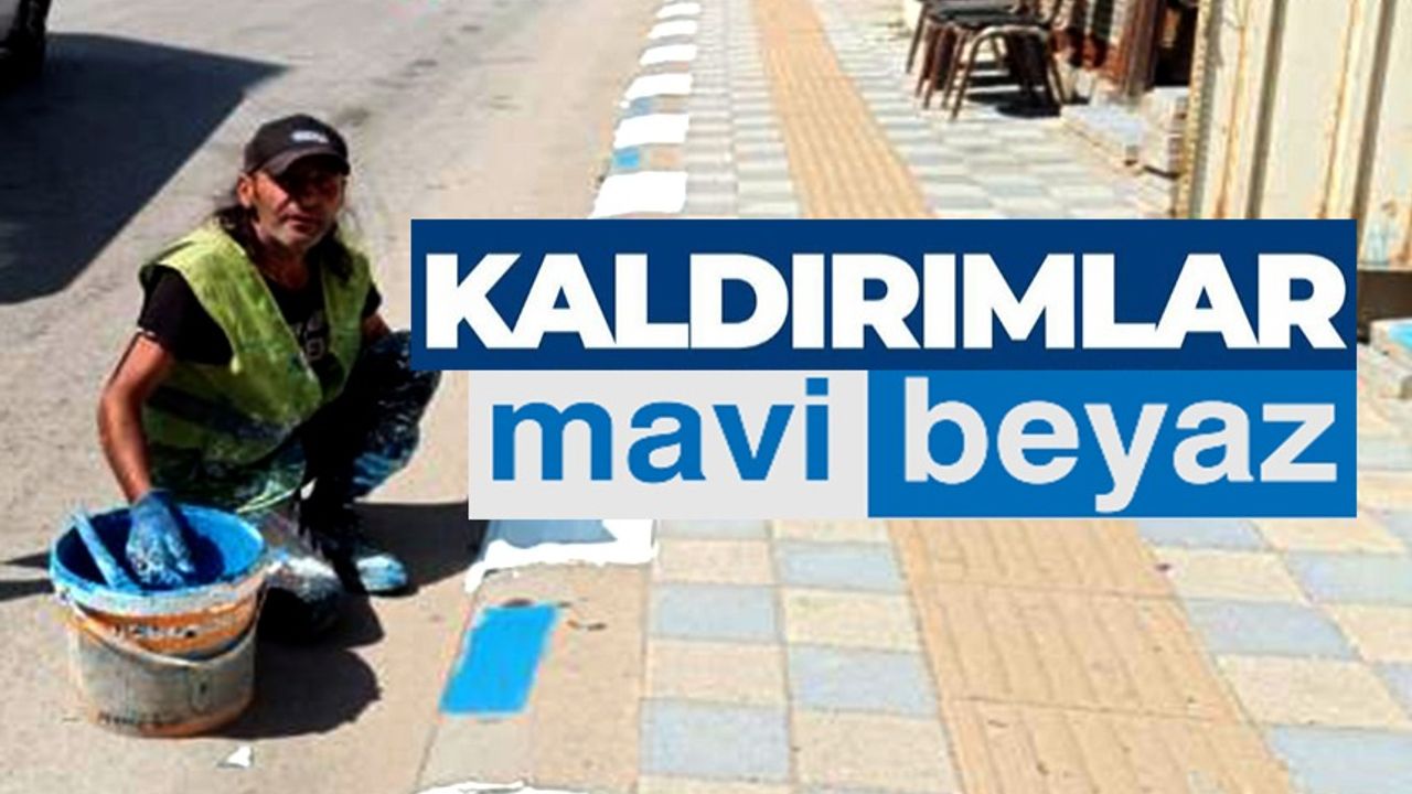 Bilecik'in Pazaryeri ilçesinde belediye ekipleri, ilçe merkezindeki ana caddelerde bulunan kaldırım taşlarını mavi ve beyaz renge boyadı.