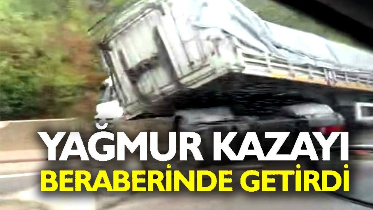 Yağışın etkisi ile sürücüsünün kontrolünden çıkan tır, orta refüje çarparak makasladı. Kaza sebebi ile bölgede uzun araç kuyrukları oluştu.