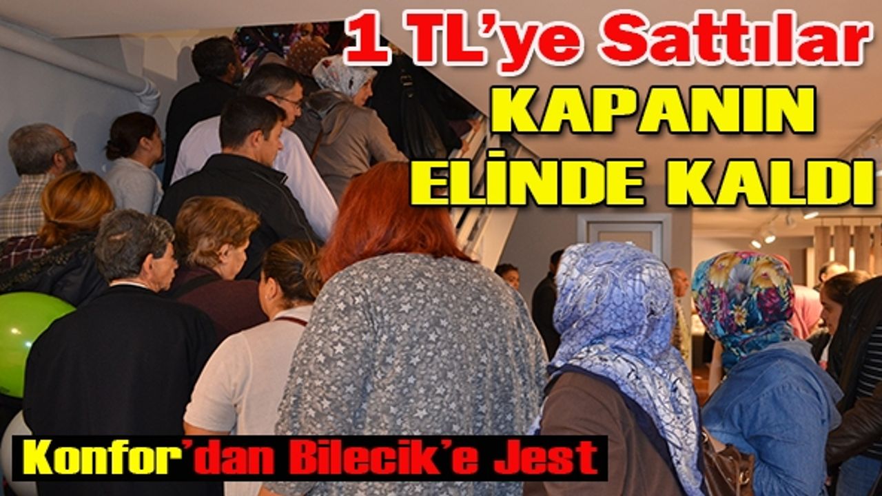 Bilecik’te yıllarca faaliyet gösteren Eltaş Mağazaları yeni açtıkları Konfor Mobilya dükkanında açılışında yastık 1 TL’ye, değeri 650 TL olan üçlü kanepeyi 219 TL’ye, 258 TL’lik çift kişilik yatak ise; 119 TL’ye satılınca mağaza önünde uzun kuyruk oluşturuldu.