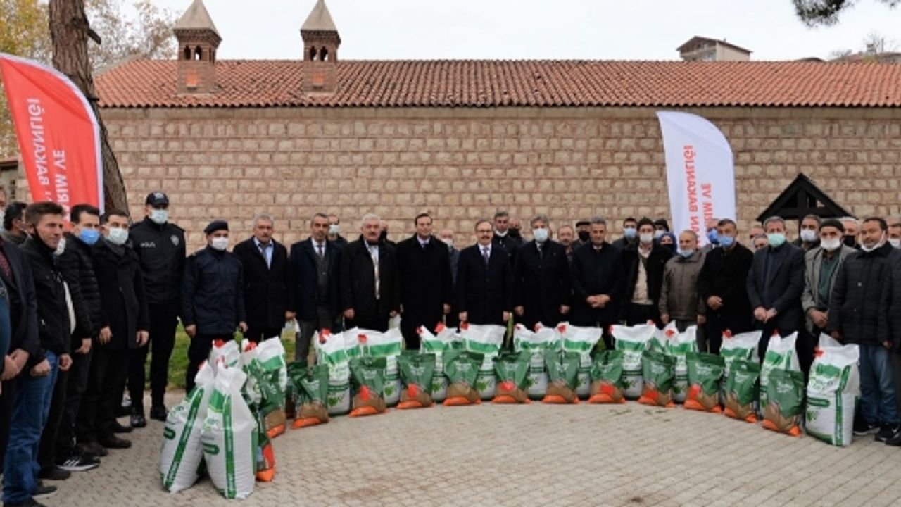 Vali Kızılkaya, Bilecik'in Gölpazarı ilçesinde 'yemimi üretiyorum işletmemi büyütüyorum' projesi kapsamında 200 çiftçiye yulaf, yem bezelyesi ve yonca tohumu dağıtıldı.
