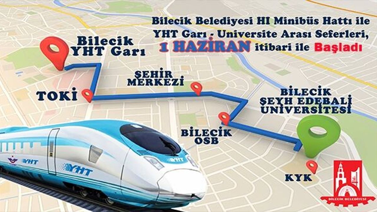 Bilecik’i, İstanbul, Kocaeli, Adapazarı, Eskişehir, Ankara ve Konya gibi metropol şehirler ile bağlantısını kuran Yüksek Hızlı Tren (YHT) seferleri 1 Haziran'da başladı. Buna eş olarak ise Bilecik Belediyesi Minibüs hattı da vatandaşlarımızın bu anlamdaki ulaşımlarını eş zamanda sağlamaya başladı. H1 minibüs hattı ile gerçekleştirilecek olan ulaşım ağı, YHT garından başlayarak, TOKİ, Küçük Sanayi, Organize Sanayi, Bilecik Şeyh Edebali Üniversitesi ve Kredi Yurtlar Kurumu (KYK) Yurdu arasında vatandaşlarımızın ulaşımını sağlayacak. Bugün KYK'dan saat: 07:00'de başlayan seferler, gece 24:00 saatlerine kadar çalışacak. Yine aynı şekilde seferler Yüksek Hızlı Tren Garından saat: 07:15'ten başlayarak, şehir merkezi ve KYK'na kadar, vatandaşlarımızın ulaşımını sağlayacak.
