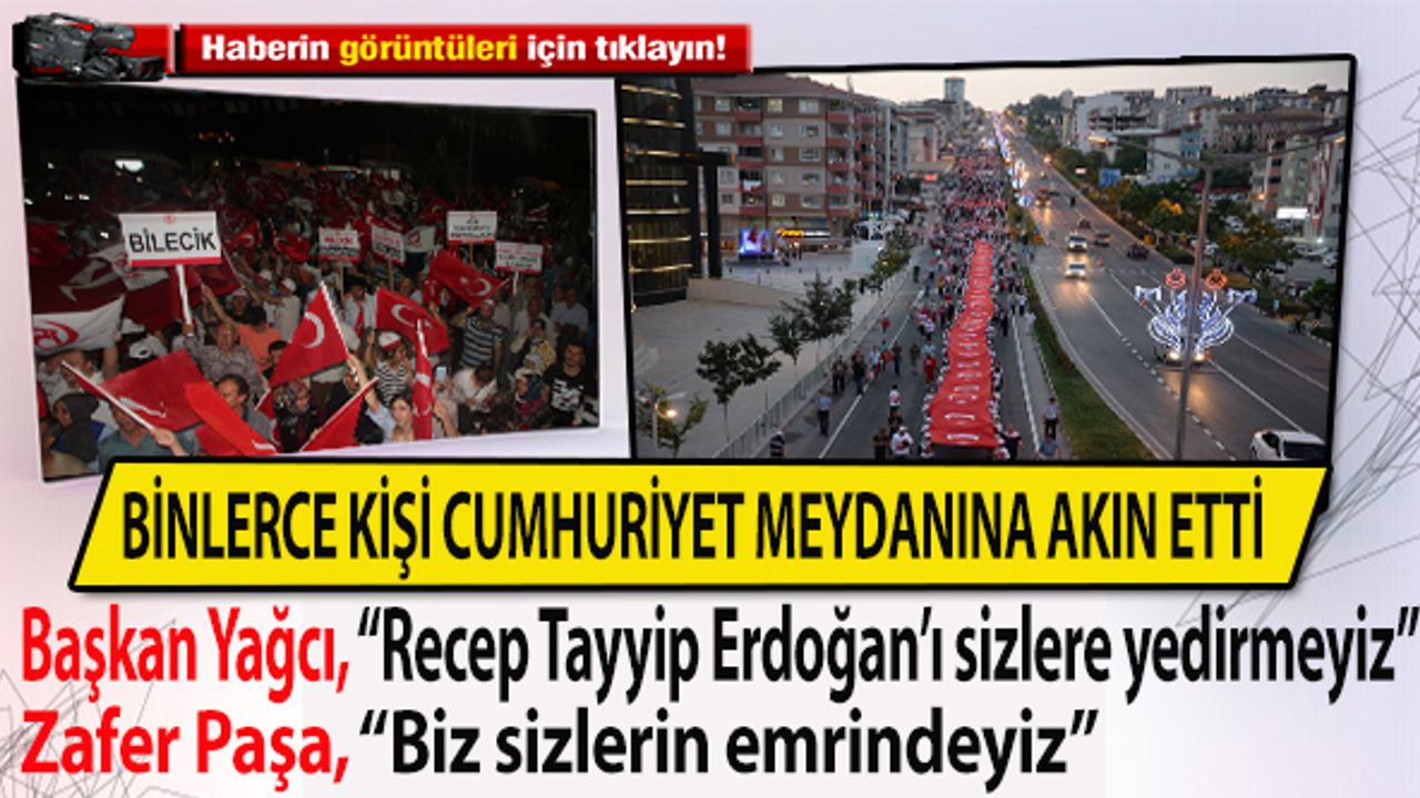 Meydanda toplanan binlerce kişiye hitap eden Bilecik Belediye Başkanı Selim Yağcı, 15 Temmuz 2016 gecesi hain terör örgütü FETÖ tarafından gerçekleştirilen kalkışmanın millet tarafından önlenmesinin yıl dönümü olduğunu belirtti. Yağcı, "15 Temmuz 2016 rastgele bir tarih değil. Bu milletin tarihinde birçok zaferler var, birçok destanlar var, birçok savaşlar var. Ama içlerindeki 15 Temmuz’da yapılan hain bir girişimi. O akşam cehaleti savunan, kötülüğü savunan bu cennet vatanı geriye götürmeyi savunan ve milli iradeyi ayaklar altına almayı hedefleyen dış güçler tarafından beslenen hain, kalleş bir örgüt ve onun dış ve iç yardakçıları, yardımcıları vardı. Diğer taraftan başka bir grup vardı.
