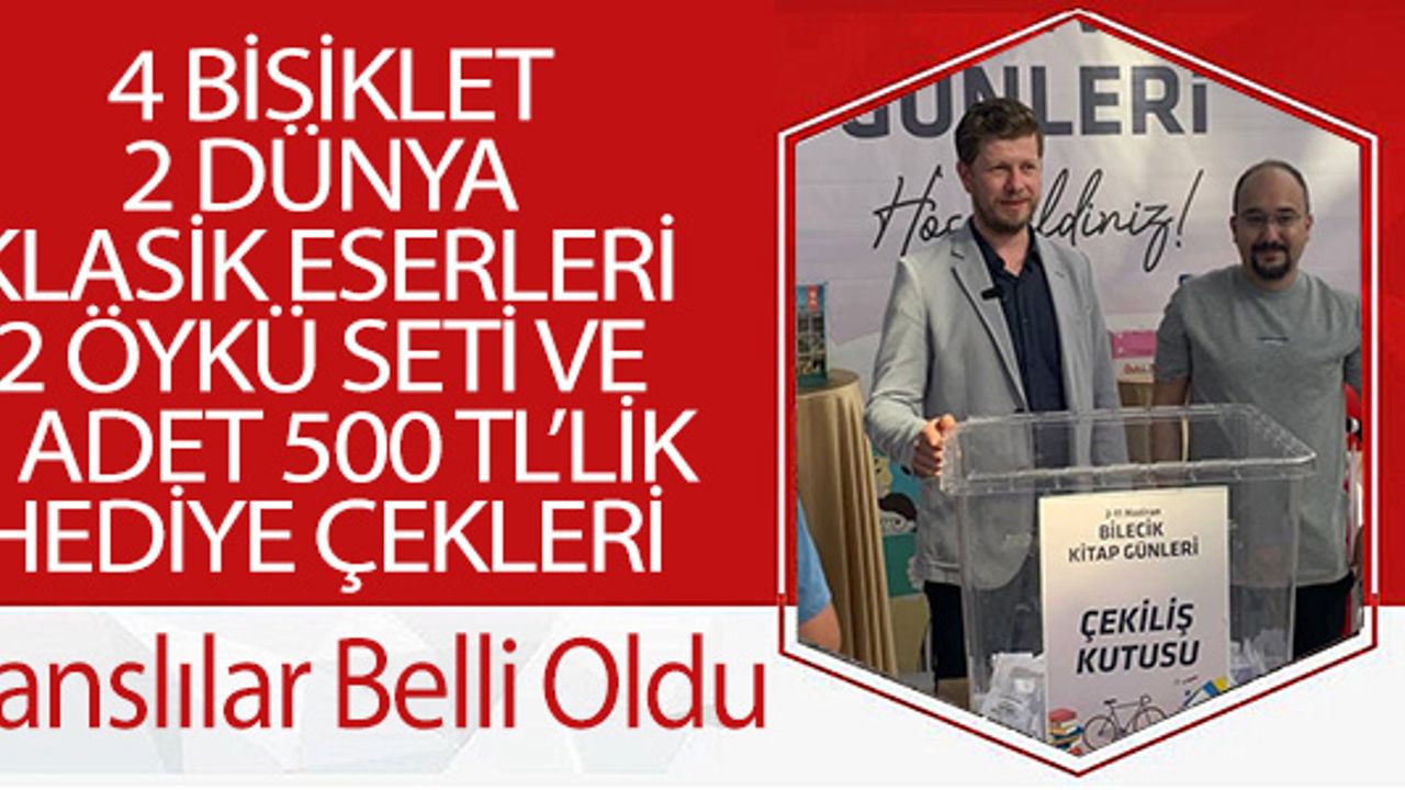 Bilecik'in kültür ve sanat hayatına renk katan Kitap Günleri’nden onlarca yazar Kitap Kafe'de okuyucularıyla buluşurken, özel çekilişler de yapıldı. Yazarların imzalı kitaplarını alarak çekilişe katılan okurlar için gerçekleştirilen çekiliş sonucunda 4 bisiklet, 2 dünya klasik eserleri 2 öykü seti ve 2 adet 500 TL’lik hediye çekleri ile ödüllendirildi. Bilecik Belediyesi kurumsal sosyal medya hesaplarından paylaşılan numaraların sahipleri, ödüllerini almak için biletleri ile birlikte 19 Haziran 2023 Pazartesi gününe kadar Şeyh Edebali Kültür ve Kongre Merkezine başvurmaları gerektiği belirtildi.