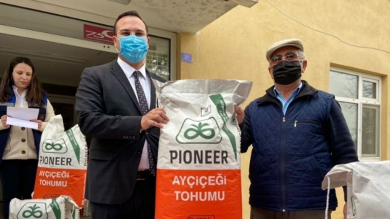 Konuşmanın ardından Kaymakam Şahin ve beraberindekiler, çiftçilere ayçiçeği tohumu dağıttı.