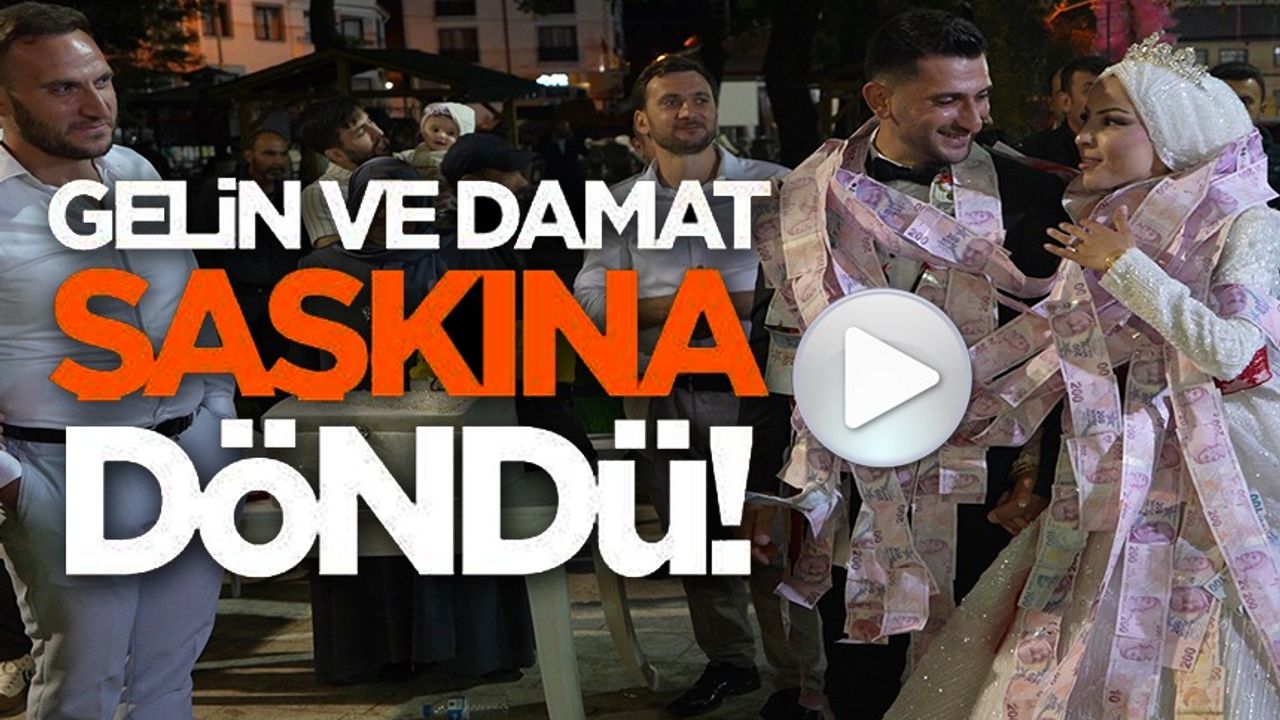 Bilecik'te bir düğünde gelin ile damada boyu 15 metreye ulaşan para kurdelesi takıldı.