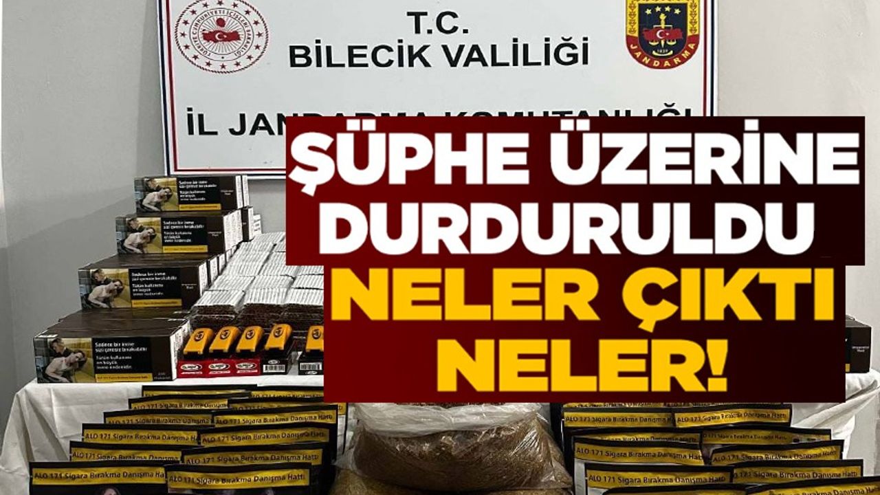 Bilecik İl Jandarma Komutanlığı ekipleri tarafından Pazaryeri ilçesi Kınık köyü yakınlarında şüphe üzerine durdurulan bir araçta arama yapıldı. Yapılan aramada; 20 bin 100 adet doldurulmuş makaron, 12 kilogram kıyılmış tütün, 1 adet dijital terazi, 10 bin adet boş makaron, 5 kilogram kaçak çay, 54 adet 100 gramlık kapalı tütün (5,4 kilogram), 125 adet sigara ağızlığı, 15 adet el tipi sigara sarma makinesi ve 112 adet tütün sarma kâğıdı ele geçirildi.