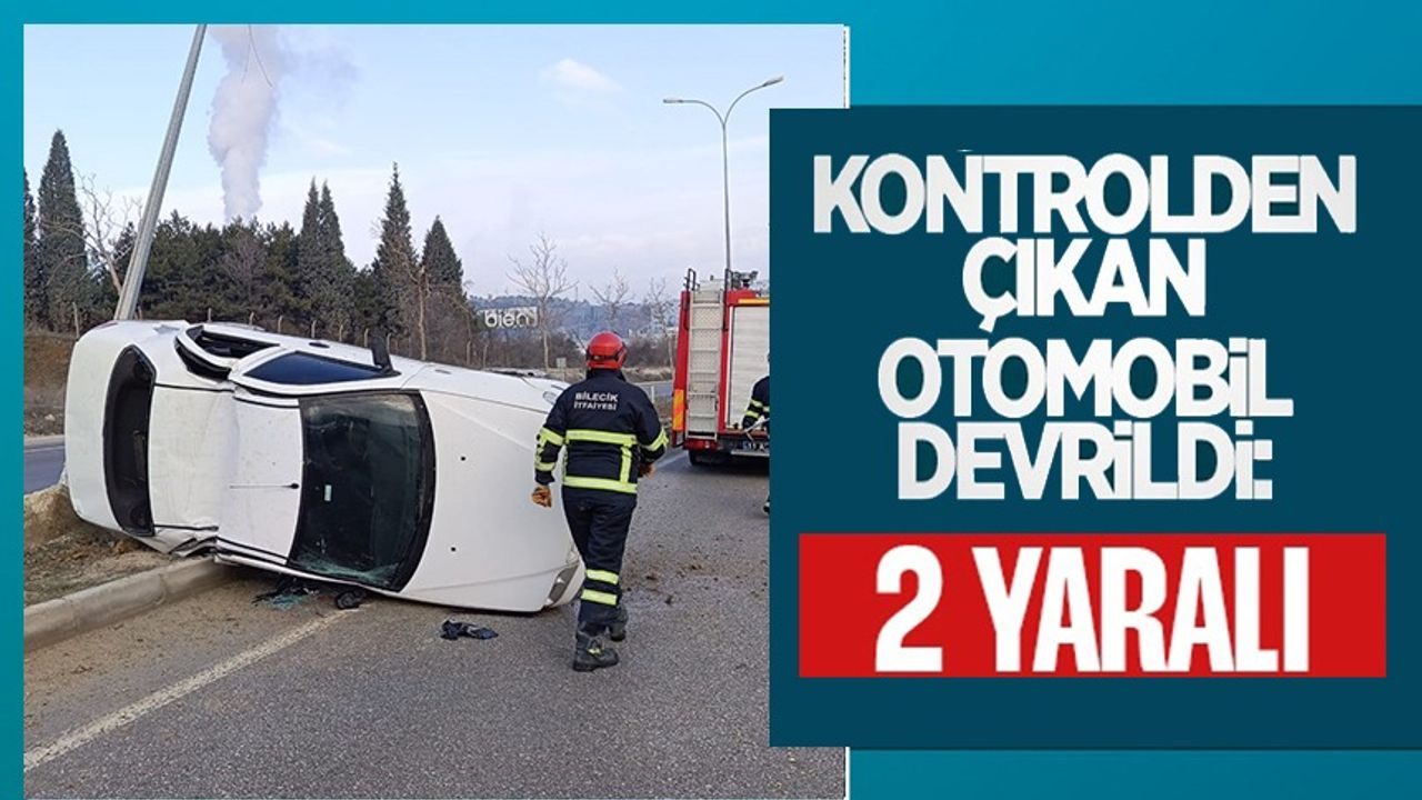 Bilecik'te seyir halinde kontrolden çıkan otomobil orta refüje çarparak devrilirken, araçtan bulunan 2 kişi yaralandı.