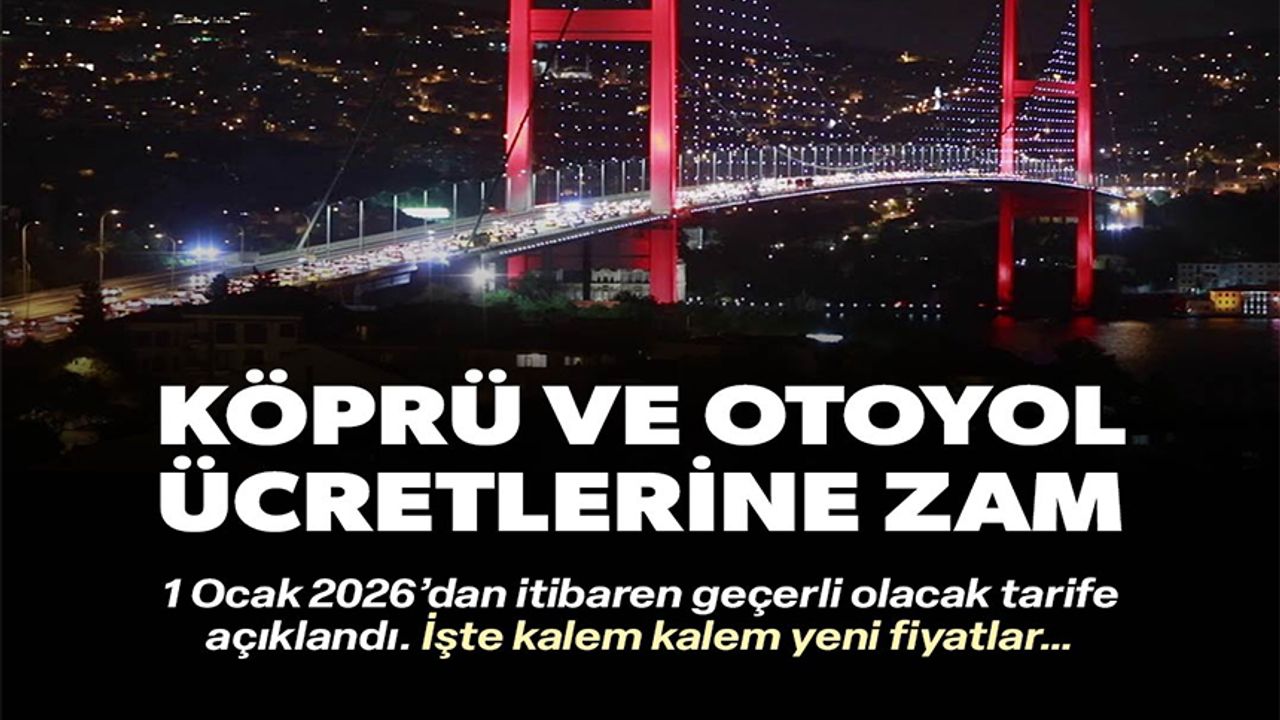1 Ocak 2026'dan itibaren geçerli olacak köprü ve otoyol ücretleri açıklandı. Buna göre otomobiller için; 15 Temmuz ve Fatih Sultan Mehmet Köprüsü tek yön ücreti 59; Yavuz Sultan Selim Köprüsü 100 ; Osmangazi Köprüsü ve Çanakkale 1915 Köprüsü 998; Avrasya Tüneli ise 228 Türk Lirası oldu.Karayolları Genel Müdürlüğünce ve Yap-İşlet-Devret (YİD) kapsamında özel şirketler tarafından işletilen otoyol ve köprülerin geçiş ücretleri, 1 Ocak 2026 Perşembe günü saat 00.00'dan itibaren geçerli olmak üzere yeniden düzenlendi.