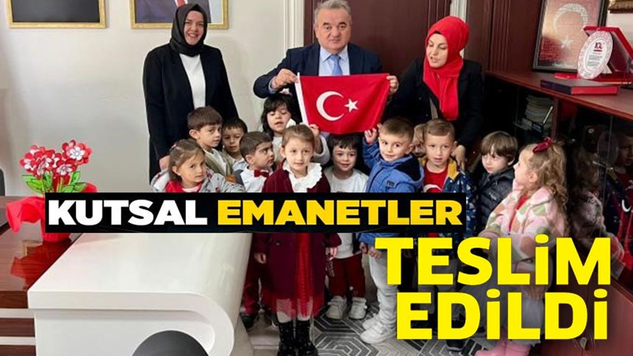 Bilecik'in Bozüyük ilçesinde, Halime Hatun Anaokulu öğrencileri tarafından yürütülen "Kutsal Emanet" projesi kapsamında hazırlanan Bayrak Zinciri, Bozüyük Kaymakamı Adem Öztürk'e takdim edildi. Kaymakam Öztürk, öğrencilerle bir araya geldiği ziyarette, proje sürecinde emeği geçen idareci, öğretmen ve öğrencileri tebrik etti. Öztürk, milli ve manevi değerlere sahip çıkmanın önemine değinerek, "Geleceğimizin teminatı çocuklarımızın bu tür anlamlı projelerde yer alması bizler için büyük gurur kaynağıdır. Milli değerlerimizi öğrenmeleri ve yaşatmaları için her zaman yanlarında olacağız" dedi.