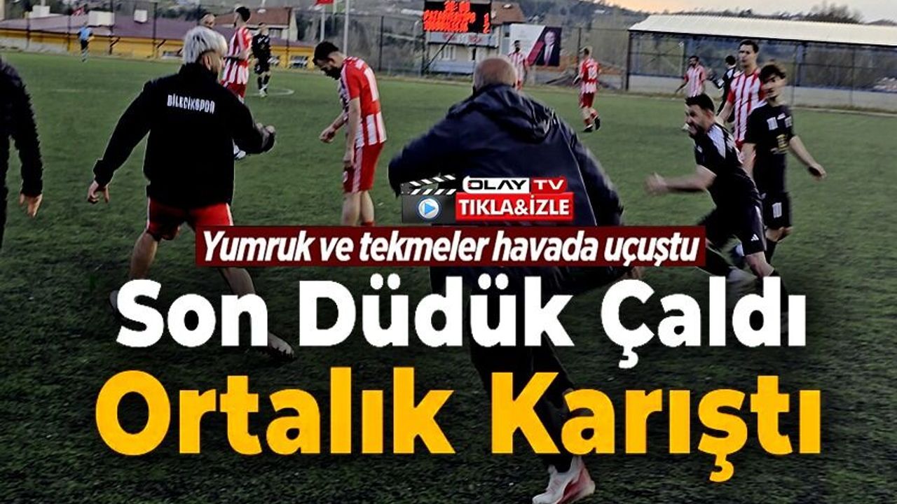 Bilecik'te oynanan 1. Amatör Lig play-off müsabakası sonrası saha içi adeta ringe dönerken, uçan tekmeler ve yumruklar havada uçuştu.