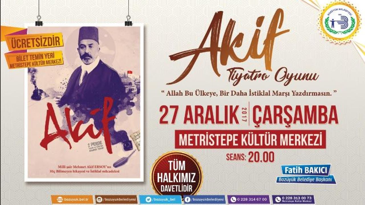 Bozüyük Belediye Başkanlığı tarafından düzenlenen anma etkinliği kapsamında “Akif” adlı tiyatro oyunu Metristepe Kültür Merkezi’nde 27 Aralık 2017 Çarşamba günü akşamı saat 20:00’de sahnelenecek. “Allah bu ülkeye, bir daha İstiklal Marşı yazdırmasın” diyen milli şairimiz Mehmet Akif Ersoy’un hiç bilinmeyen hikâyesinin ve İstiklal mücadelesinin anlatıldığı 2 perdelik tiyatro oyununu Mahmud Tahsin yazdı ve yönetti. Tüm Bozüyüklülerin davetli olduğu oyunun ücretsiz biletleri ise 26 Aralık 2017 Salı gününden itibaren Bozüyük Belediyesi Metristepe Kültür Merkezi’nden temin edilebilecek.