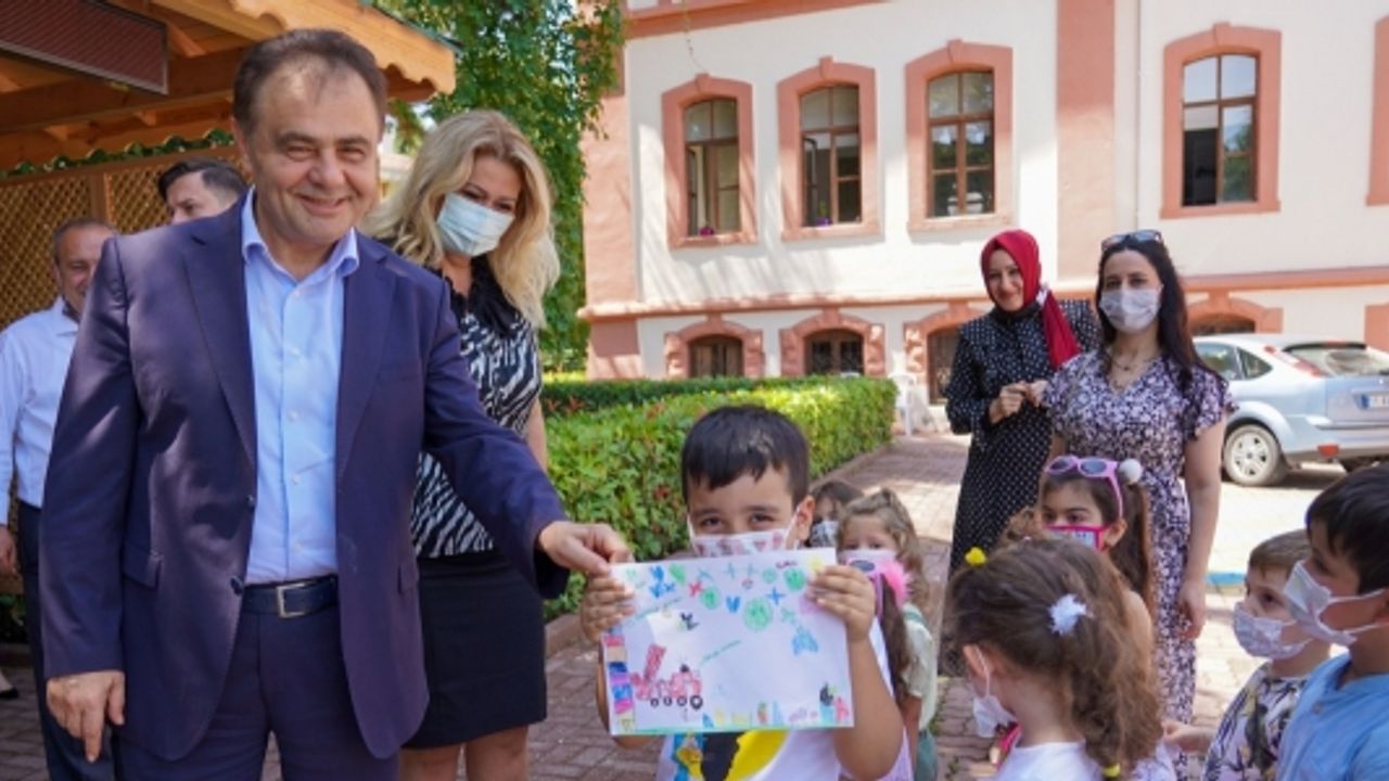 Bilecik'te eğitim gören bir anaokulu öğrencileri, ziyaret ettikleri Belediye Başkanı Semih Şahin'e çizdikleri resimleri hediye ettiler.