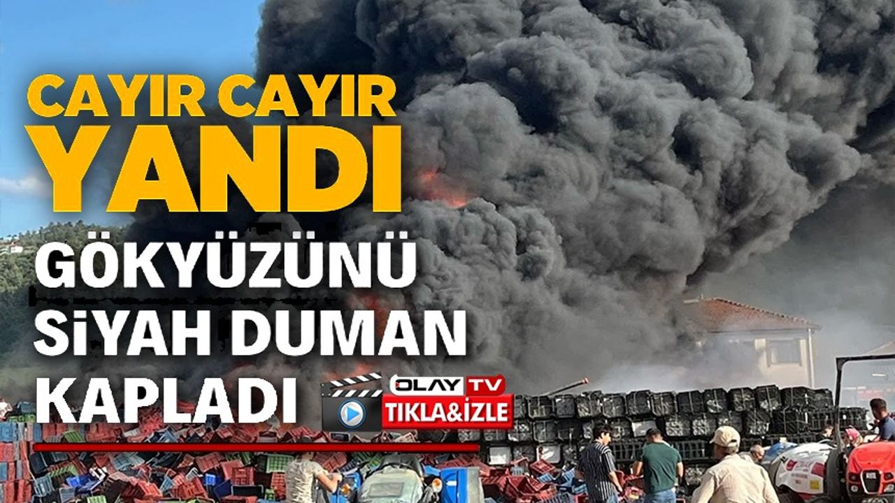 Bilecik'te bir soğuk hava deposu önündeki plastik kasalar tutuştu, gökyüzünü siyah duman kapladı.