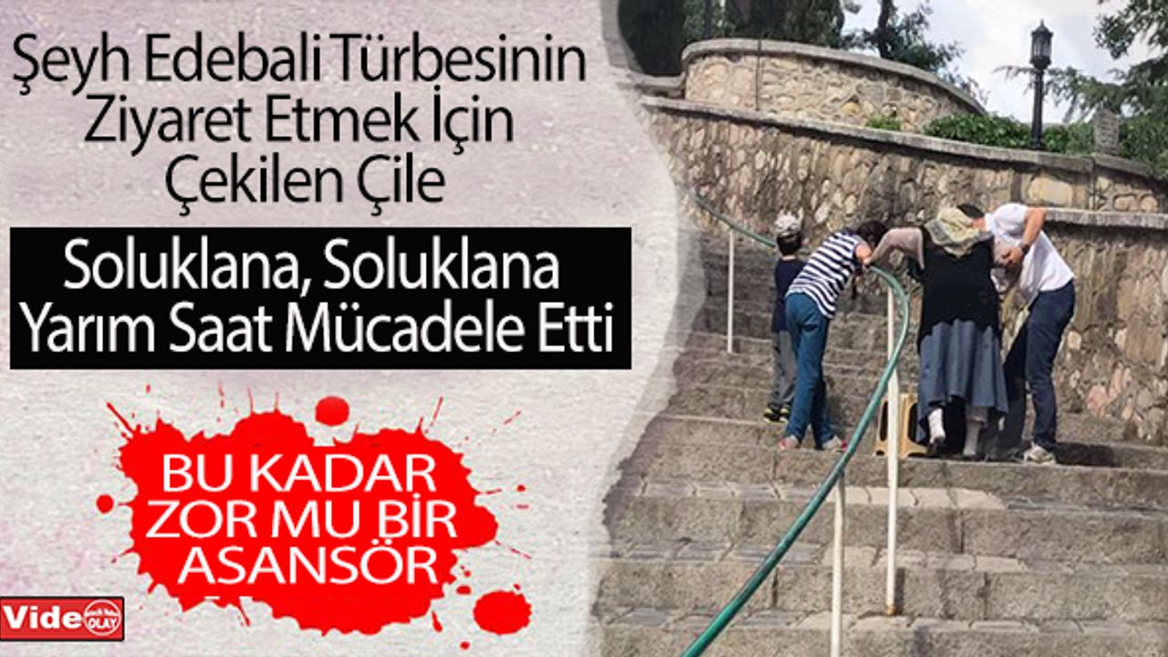 Adı öğrenilemeyen ve yaşı tahminen 80 olan yaşlı bir teyze, Şeyh Edebali’yi ziyaret etmek için yaklaşık yarım saat çile çekti. Yanında oğlu ve biri kız iki torunu ile türbeye çıkmak isteyen yaşlı teyze, dik merdivenleri çıkarken torununun taşıdığı tabureye oturarak dinlendi. Dakikalar sonra sonra türbeye ulaşan yaşlı teyzenin bu zorluğu karşı gösterdiği çaba, bir vatandaş cep telefonu tarafından görüntülenirken, vatandaşlar yetkililerden bir an önce türbeye bir asansör yapılmasını talep ettiler.