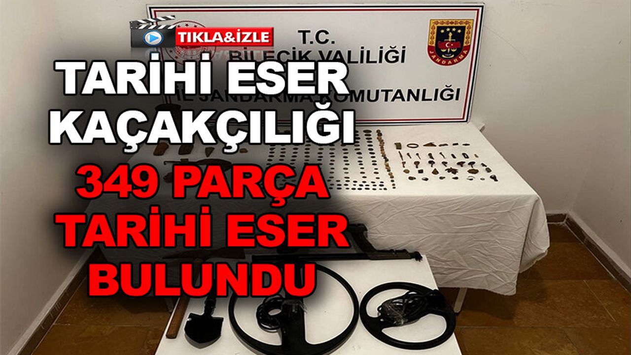 Bilecik İl Emniyet Müdürlüğü KOM Şube Müdürlüğü ve Söğüt İlçe Jandarma Komutanlığı ekipleri, N.Ş. isimli şahsın ikametinde ortaklaşa yapılan adli aramada, çok sayıda tarihi eser niteliği taşıyan malzemeyi ele geçirdi. Operasyonda; 168 adet çeşitli ebatlarda sikke, 80 taş obje, 36 yüzük, 31 madeni para, 21 yuvarlak taş obje, 9 çömlek parçası, 1 metal vazo, 1 orak, 1 metal kase ve 1 kase altı obje olmak üzere toplam 349 parça tarihi eser ile 1 dedektör, 1 kazma ve 1 kürek bulundu.