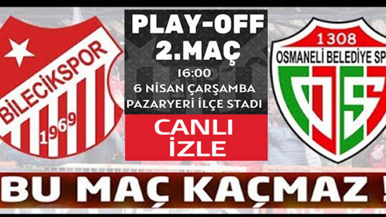 6 Nisan Çarşamba günü saat 16:00'da Pazaryeri İlçe Stadı'nda oynanacak olan Bilecikspor-1308 Osmaneli Belediyespor Play-Off grubu 2'inci hafta karşılaşmasını YouTube kanalımızdan canlı izleyebilirsiniz.